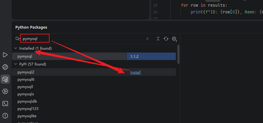 在打开的窗口顶部的搜索框中,输入 pymysql。