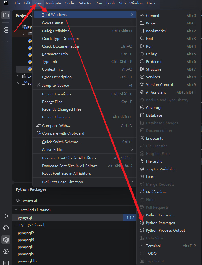 在 PyCharm 窗口的左侧边栏,找到并点击 Python Packages 标签。如果你没找到它,可以通过顶部菜单 View -> Tool Windows -> Python Packages 打开。