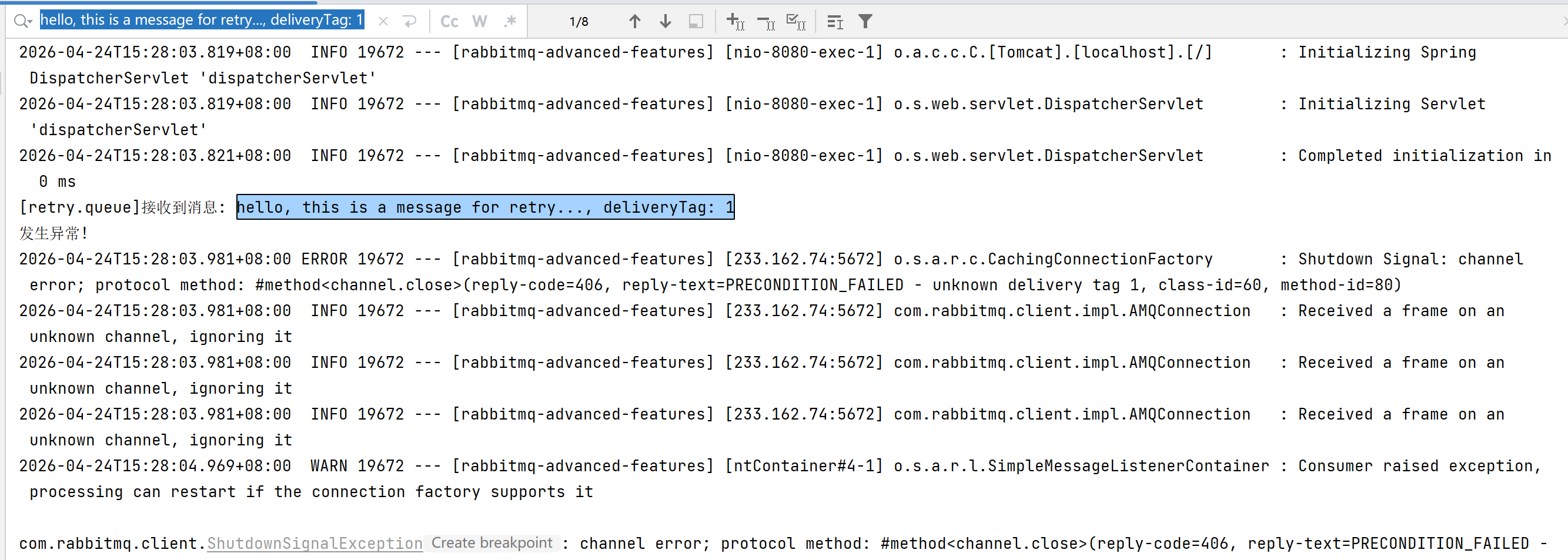 可以看到,消息重试 5 次后,抛出异常。