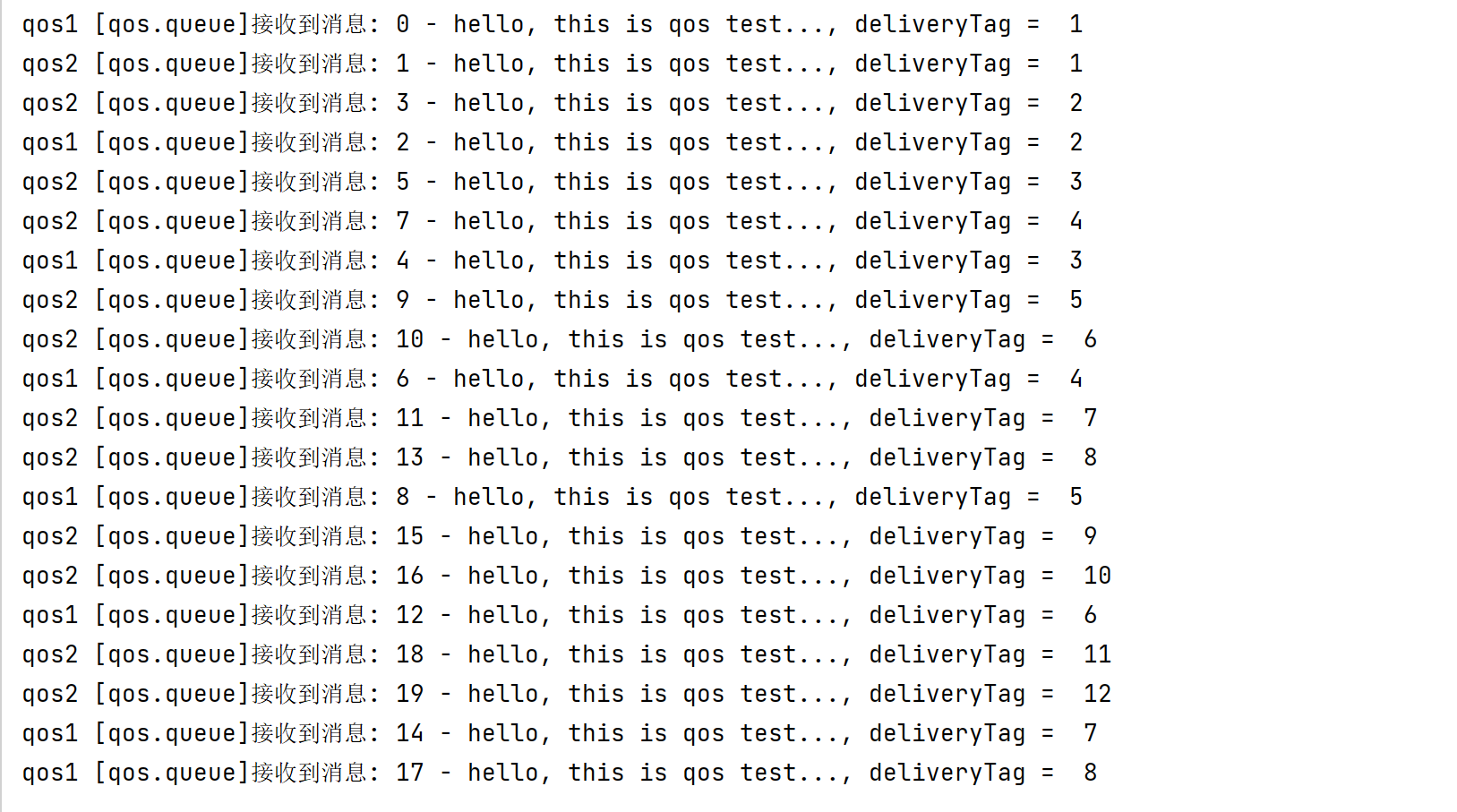 System.out.printf("qos2 [" + Constants.QOS_QUEUE + "]接收到消息: %s, deliveryTag = %d\n", new String(message.getBody(), "utf8"), deliveryTag);