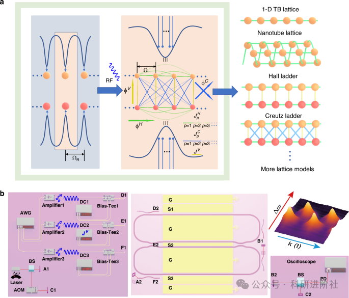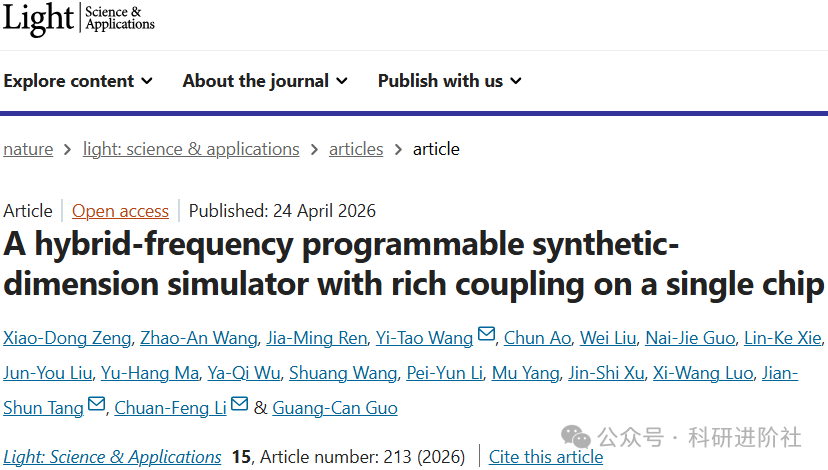 在量子计算尚未全面普及的今天,科学家们正借助"模拟量子计算"探索高维物理现象。近日,中国科学技术大学团队在《Light: Science & Applications》上发表了一项重磅研究(https://doi.org/10.1038/s41377-026-02309-2):他们利用薄膜铌酸锂(TFLN)光子芯片,构建了一种混合频率可编程合成维度模拟器,在单一芯片上实现了多种复杂晶格模型的模拟,包括对称、非对称和长程耦合系统。