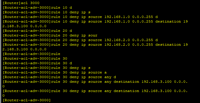 Router\]acl 3000 \[Router-acl-adv-3000\]rule 10 d \[Router-acl-adv-3000\]rule 10 deny ip s \[Router-acl-adv-3000\]rule 10 deny ip source 192.168.1.0 0.0.0.255 d \[Router-acl-adv-3000\]rule 10 deny ip source 192.168.1.0 0.0.0.255 destination 19 2.168.3.100 0.0.0.0 \[Router-acl-adv-3000\]rule 20 d \[Router-acl-adv-3000\]rule 20 deny ip sour \[Router-acl-adv-3000\]rule 20 deny ip source 192.168.2.0 0.0.0.255 d \[Router-acl-adv-3000\]rule 20 deny ip source 192.168.2.0 0.0.0.255 destination 19 2.168.3.100 0.0.0.0 \[Router-acl-adv-3000\]rule \[Router-acl-adv-3000\]rule 30 \[Router-acl-adv-3000\]rule 30 d \[Router-acl-adv-3000\]rule 30 deny ip s \[Router-acl-adv-3000\]rule 30 deny ip source a \[Router-acl-adv-3000\]rule 30 deny ip source any d \[Router-acl-adv-3000\]rule 30 deny ip source any destination 192.168.3.100 0.0.0. 0 \[Router-acl-adv-3000\]rule 30 deny ip source any destination 192.168.3.100 0.0.0. 0 \[Router-acl-adv-3000