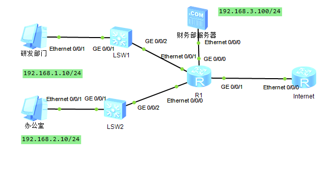 通过高级ACL实现安全策略:仅允许办公室网段访问财务服务器,禁止研发部访