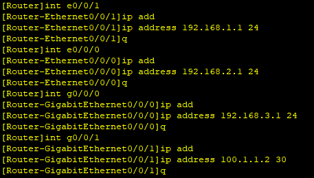 Huawei\]undo in \[Huawei\]undo info-center e \[Huawei\]undo info-center enable Info: Information center is disabled. \[Huawei\]sysna \[Huawei\]sysname Router \[Router\]int e0/0/1 \[Router-Ethernet0/0/1\]ip add \[Router-Ethernet0/0/1\]ip address 192.168.1.1 24 \[Router-Ethernet0/0/1\]q \[Router\]int e0/0/0 \[Router-Ethernet0/0/0\]ip add \[Router-Ethernet0/0/0\]ip address 192.168.2.1 24 \[Router-Ethernet0/0/0\]q \[Router\]int g0/0/0 \[Router-GigabitEthernet0/0/0\]ip add \[Router-GigabitEthernet0/0/0\]ip address 192.168.3.1 24 \[Router-GigabitEthernet0/0/0\]q \[Router\]int g0/0/1 \[Router-GigabitEthernet0/0/1\]ip add \[Router-GigabitEthernet0/0/1\]ip address 100.1.1.2 30 \[Router-GigabitEthernet0/0/1\]q