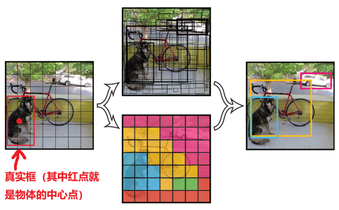 网格负责制:如果某个目标的中心点落在某个网格内,那么这个网格就负责预测该目标。