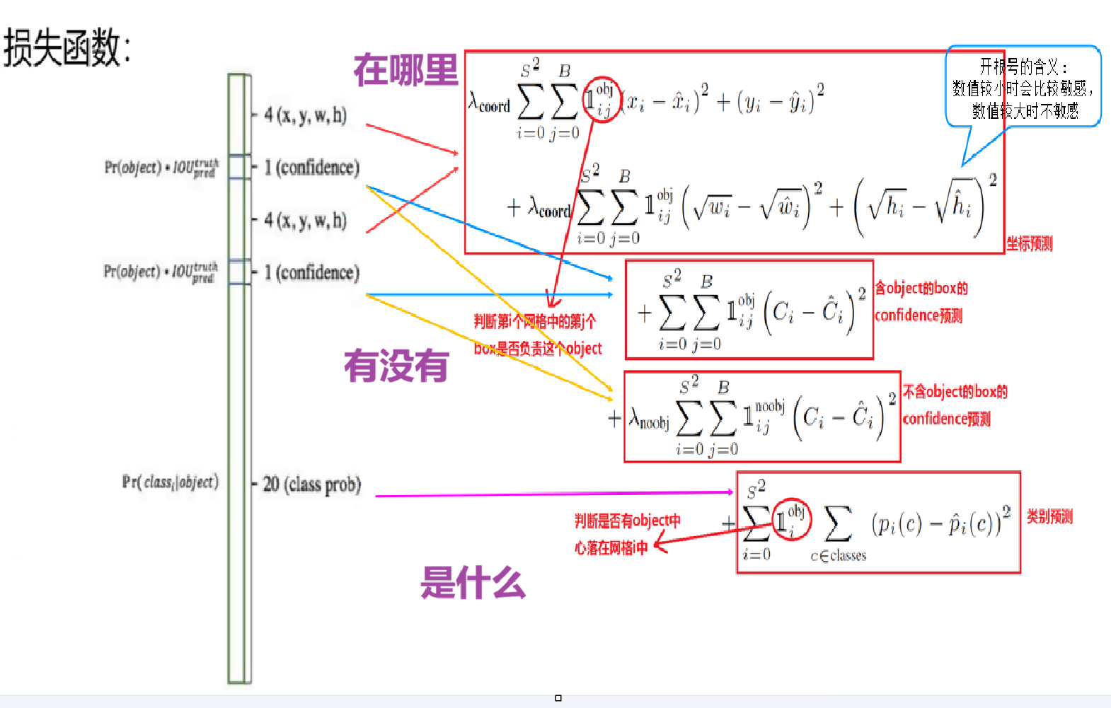 举个例子:预测大框时,偏移 10 像素可能影响不大;但预测小框时,同样偏移 10 像素可能导致严重的定位错误。通过开方,可以让小框误差获得更大的惩罚权重,一定程度上缓解了大框与小框之间的权重不均问题。