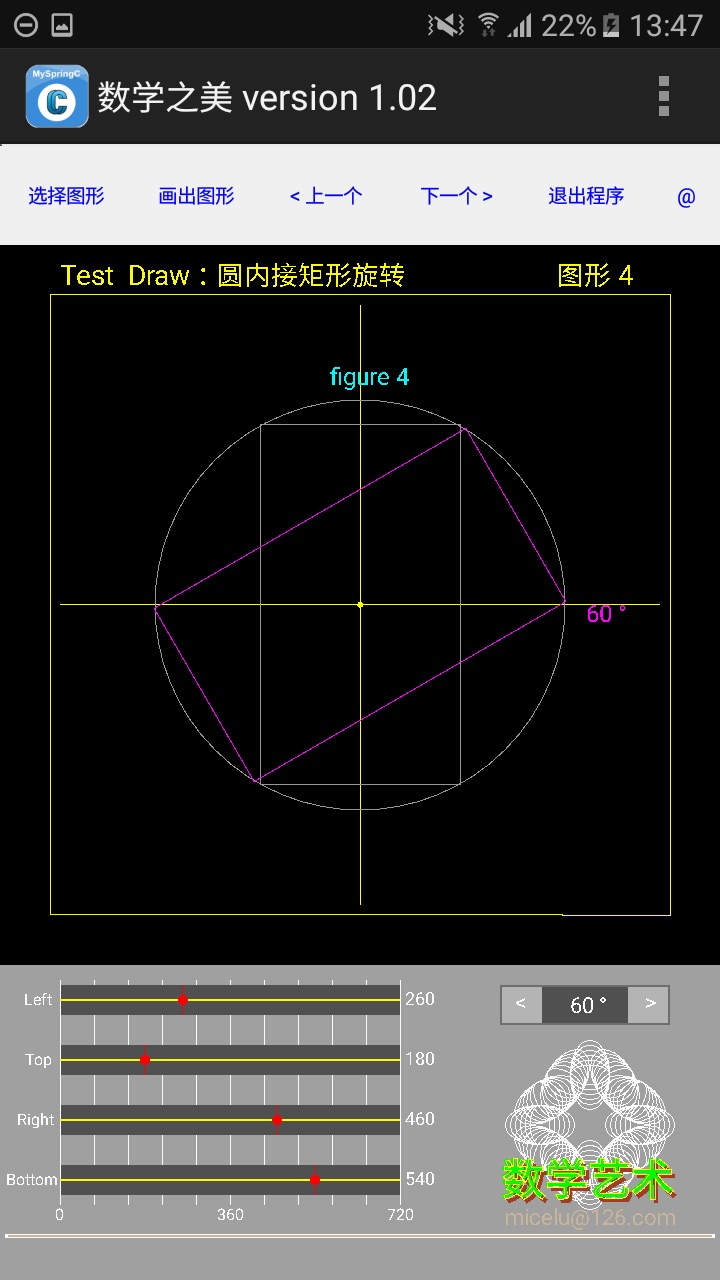 我设置的数据输入方法是,手机屏幕图形区任意位置点击,以屏幕的XY坐标值来计算直角平面坐标系四个象限的以XY轴交点为中心点的坐标,即计算绘图区的左上角 left, top, 右下角 right, bottom的坐标值,依此就可绘制图形。一、三象限的值可以通过计算转换为二、四象限的左上角右下角的值。