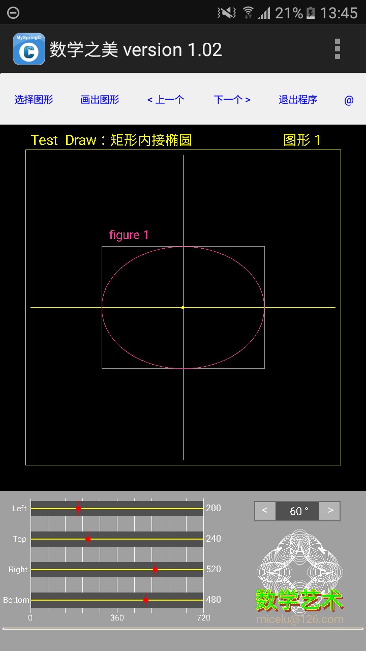还有一点说明:对于半长轴半短轴的提法语意不明确。我的理解是:x轴是横轴,y轴是纵轴,若x>y则是横向椭圆图形,y>x则是纵向椭圆图形。我以L1 (la)表示x轴,以L2 (lb)表示y轴,以此轴径来绘制椭圆。