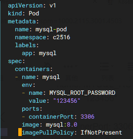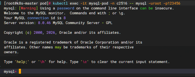 验证: kubectl exec -it mysql-pod -n c2516 -- mysql -uroot -p123456