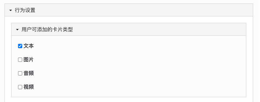 - 行为设置 → 用户可添加的卡片类型:勾选允许学生在活动中添加的卡片类型(文本、图片、音频、视频)。在实际活动界面会显示对应的添加按钮(T、图片、音频、视频)。