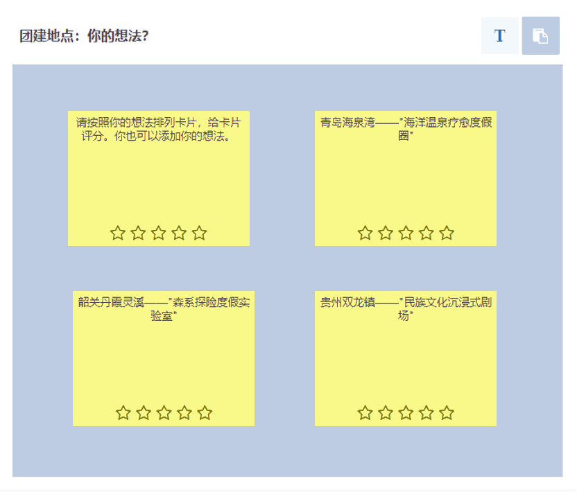 下面是我们将在本教程中创建的创意白板,示例中预置 4 张卡片,用于收集团队成员关于团建地点的想法与建议。
