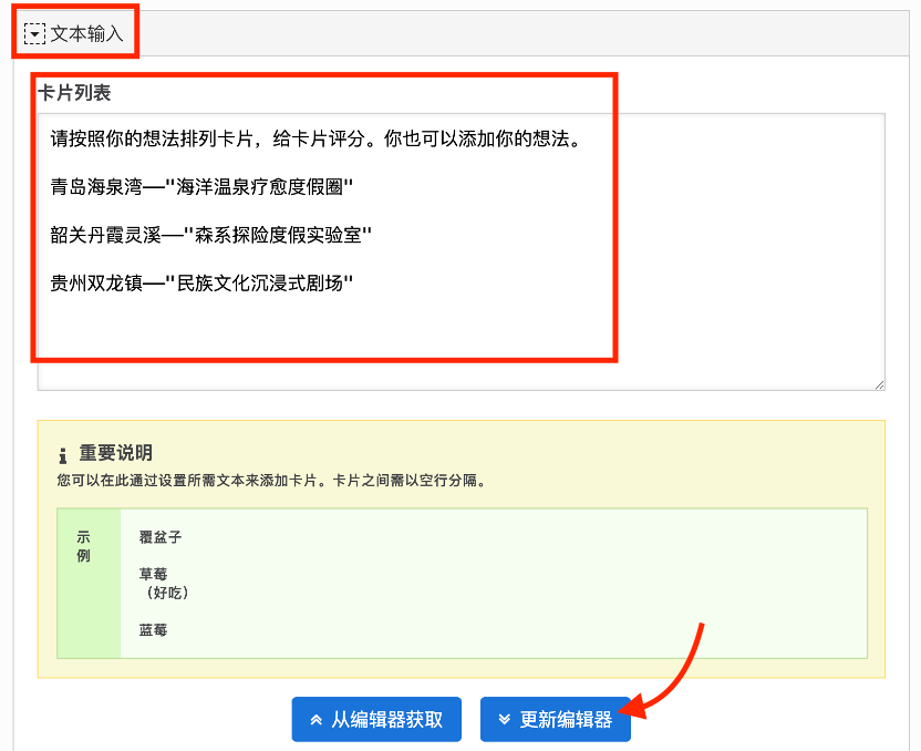 - 点击 更新编辑器,会将文本转换为卡片并出现在编辑器画布;若已在画布中手动编辑过卡片,也可点击 从编辑器获取 同步回文本框进行修改。