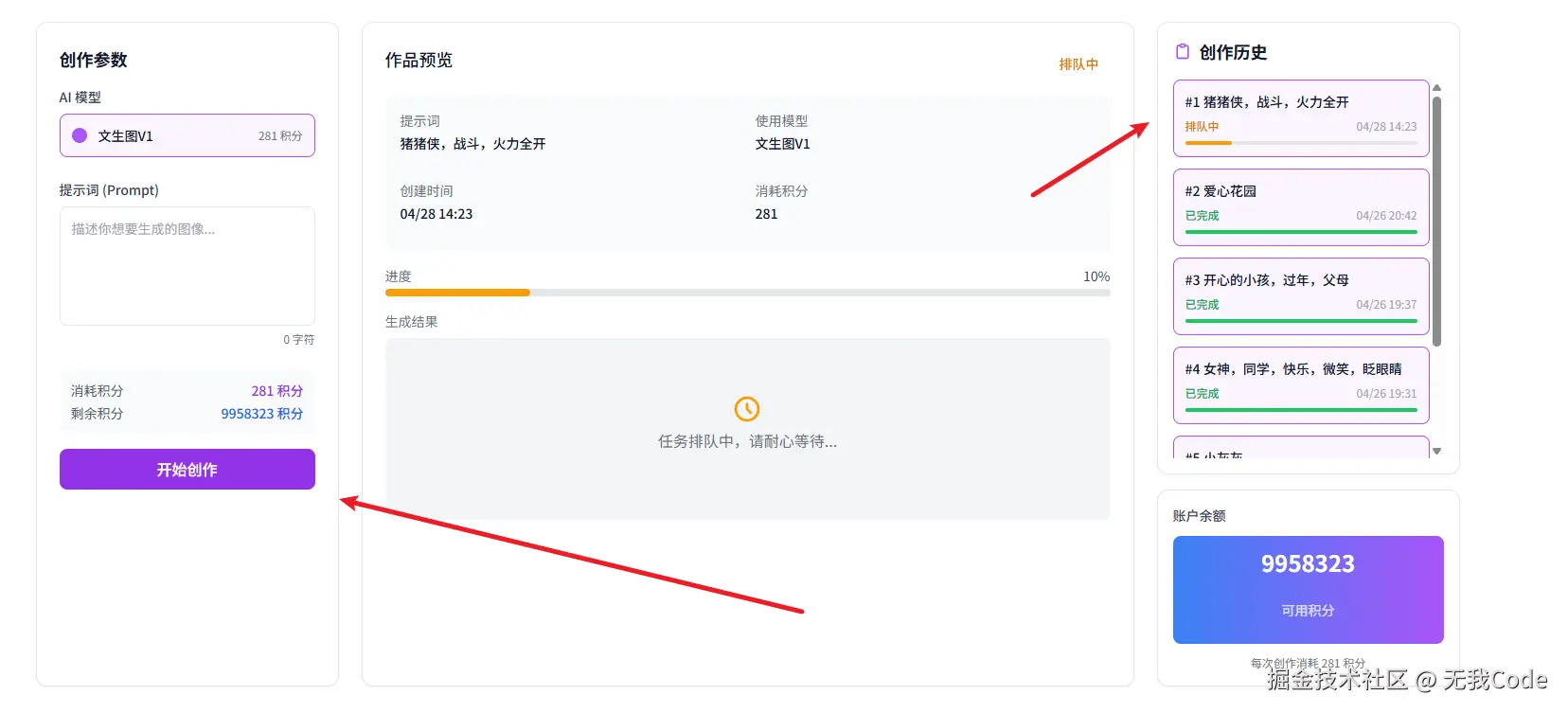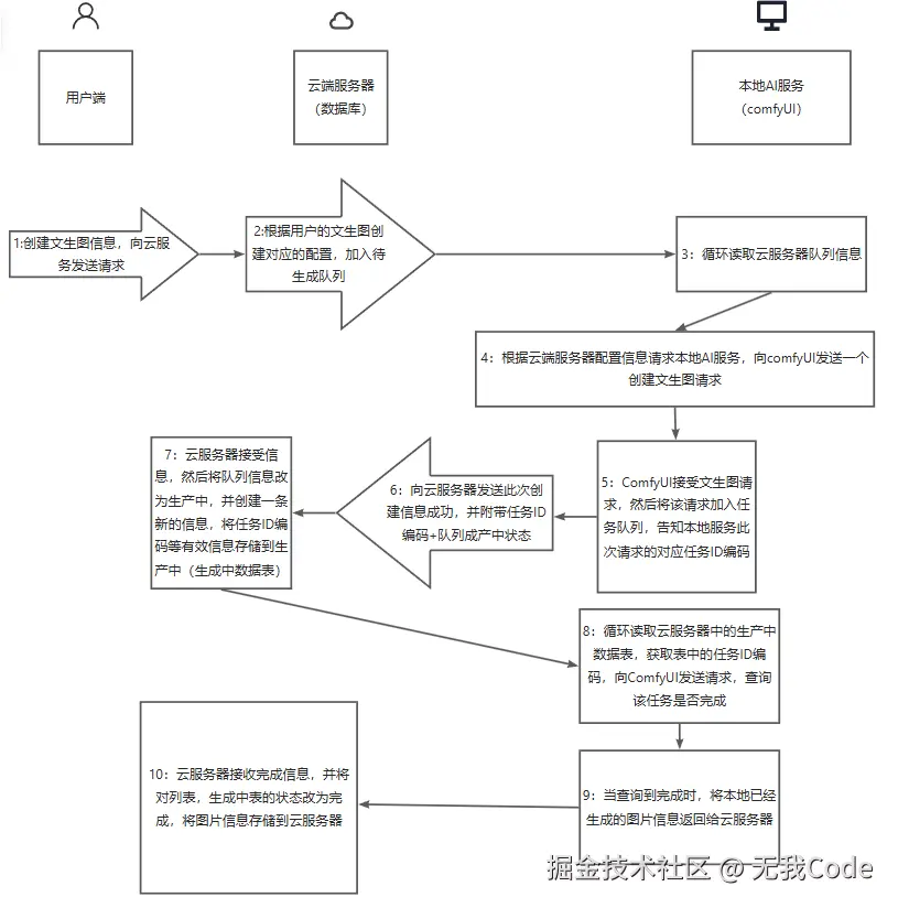 1:创建文生图信息,向云服务发送请求 2:根据用户的文生图创建对应的配置,加入待生成队列 3:循环读取云服务器队列信息 4:根据云端服务器配置信息请求本地AI服务,向comfyUI发送一个创建文生图请求 5:ComfyUI接受文生图请求,然后将该请求加入任务队列,告知本地服务此次请求的对应任务ID编码 6:向云服务器发送此次创建信息成功,并附带任务ID编码+队列成产中状态 7:云服务器接收信息,然后将队列信息改为生产中,并创建一条新的信息,将任务ID编码等有效信息存储到生产中(生成中数据表) 8:循环读取云服务器中的生产中数据表,获取表中的任务ID编码,向ComfyUI发送请求,查询该任务是否完成 9:当查询到完成时,将本地已经生成的图片信息返回给云服务器 10:云服务器接收完成信息,并将对列表,生成中表的状态改为完成,将图片信息存储到云服务器