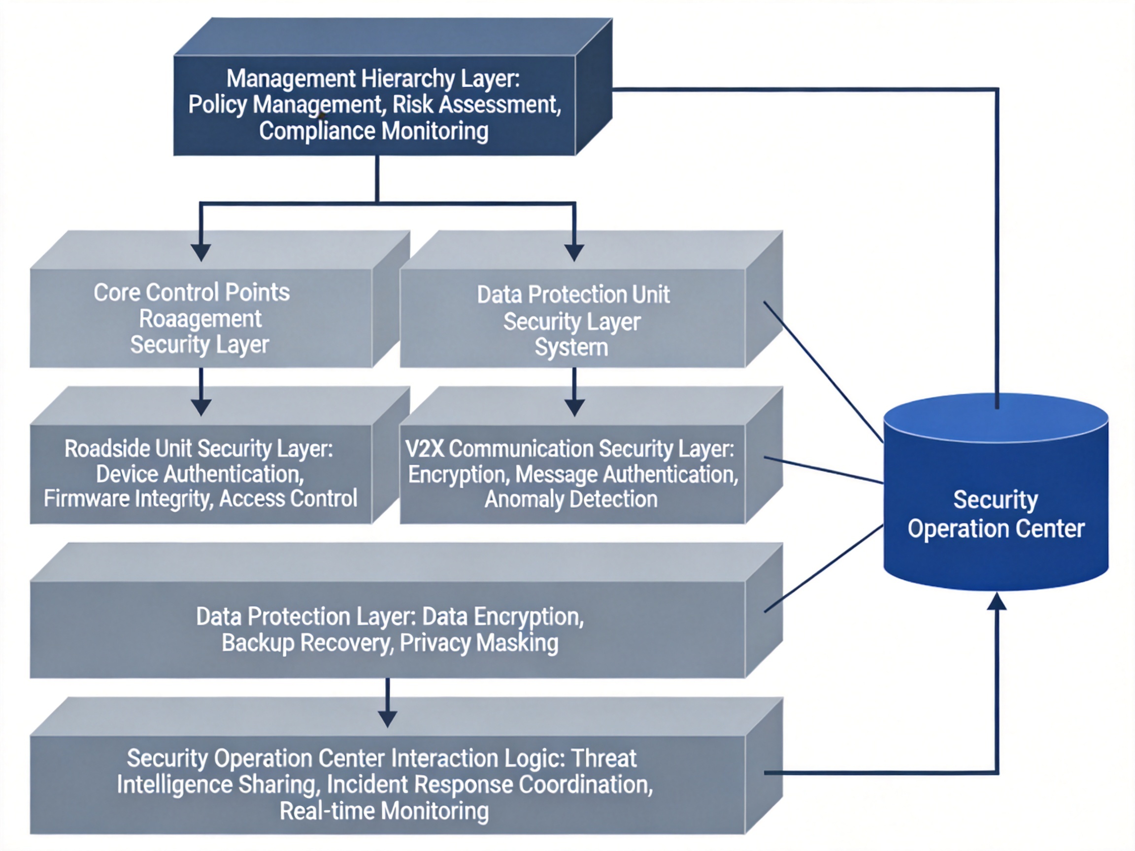 管理层面采用四层组织架构,由交通管理部门领导层负责安全战略决策,科技管理部门负责安全策略制定和监督,运维团队负责具体落地执行,同时联合安全服务商、交通设备厂商提供外部协作支持;技术层面覆盖路侧单元安全、车联网通信安全、信号控制系统安全、数据安全、应用安全等场景,特别强调车路协同通信的身份认证和数据完整性保护,避免恶意攻击者篡改交通信号。