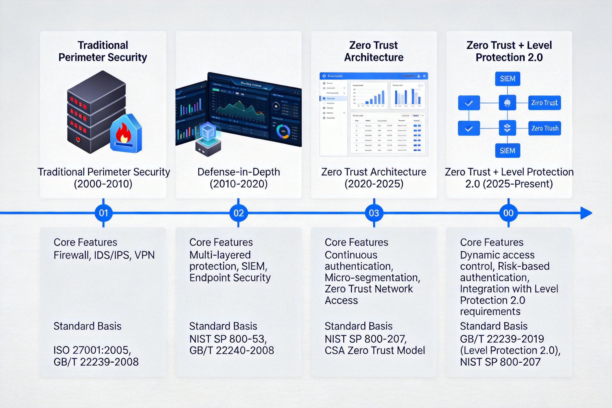我国网络安全体系建设经历了三个主要阶段:2007 年以前为制度探索期,以单点技术防护为主;2007-2017 年为等级保护 1.0 时期,形成了以信息系统分级防护为核心的制度框架;2017 年《网络安全法》颁布后进入等级保护 2.0 时期,实现了从被动防护到主动免疫、从单一系统防护到新技术全场景覆盖的体系化升级。