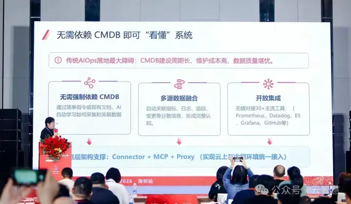 云智慧作为 AI 基础设施智能运维的服务商受邀出席,深度分享了AI SRE Agent产品------Castrel AI的创新实践,展现了云智慧的智能体(Agent)产品推动运维领域向自治化、智能化的跨越式升级。