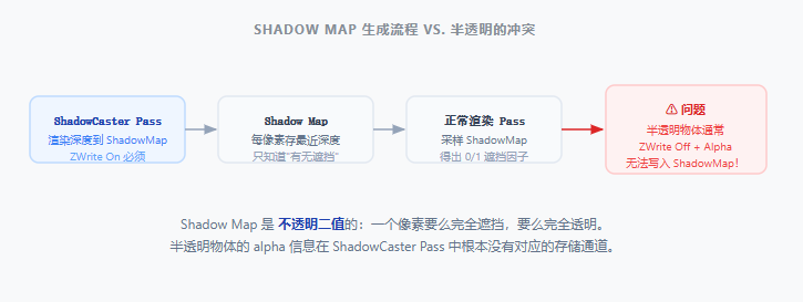 URP 的 ShadowCaster Pass 要求写入深度(ZWrite On), 而半透明渲染通道通常关闭深度写入(ZWrite Off)并依赖 Alpha Blend。 两者的技术前提本质冲突: