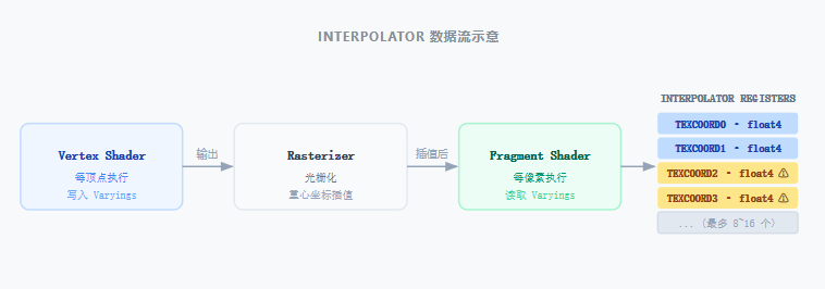 在 GPU 渲染管线中,顶点着色器(Vertex Shader)与片元着色器(Fragment Shader) 之间有一段固定宽度的数据通道------即插值寄存器(Interpolator / Varying)。 顶点阶段写入的每一个值,GPU 在光栅化时会对三角形面片做重心插值, 最终将插好的结果传递给每个片元。
