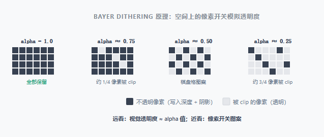 Dithering(有序抖动)的思路:用空间上的像素开关 来模拟视觉透明度------某个区域 50% 的像素被 clip 掉, 远看就像 50% 透明,同时每个未被裁剪的像素仍然是完全不透明的, 可以正常写入深度和阴影。