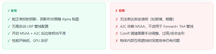 | Alpha Test + A2C 平滑边缘 | 植被、草丛、头发(MSAA 场景) | 优秀 | 低 | MSAA 开启 |