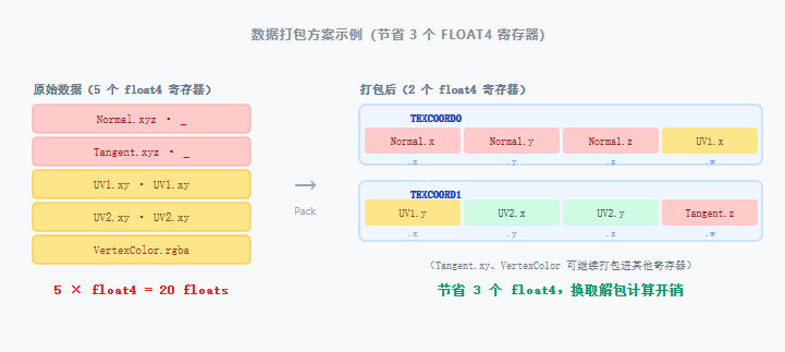 当需要传递的数据量接近或超过寄存器上限时, 最常用的手段是将多个语义相近、精度要求低于 float4 的数据 打包进同一个 float4 的 xyzw 分量, 在片元着色器再按约定拆包。