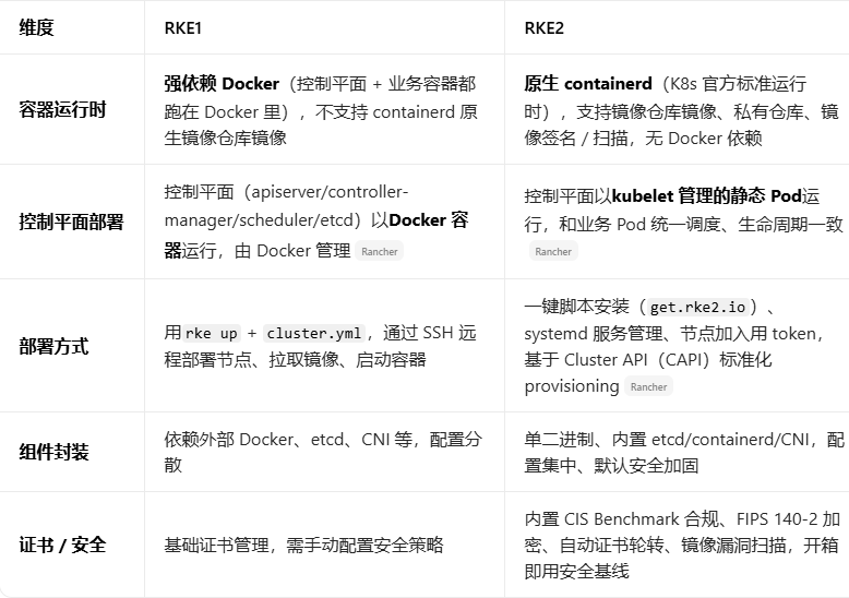 RKE1(旧版 Rancher Kubernetes Engine)和 RKE2(下一代,也叫 RKE Government)是 Rancher 的两代 K8s 发行版,核心差异在容器运行时、控制平面架构、安全合规、部署方式,且 RKE1 已进入维护末期、RKE2 是官方推荐的下一代方案。下面从核心定位、架构、部署、运维、适用场景做完整对比: