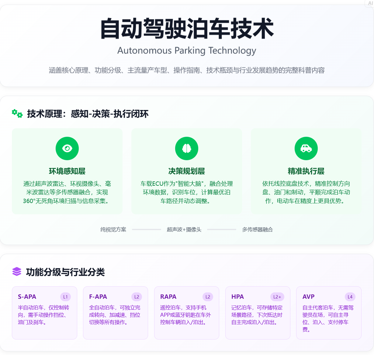 | 基础APA | 仅自动控制转向,需人工全程控制油门、刹车和换挡,属于L0级辅助泊车,依赖驾驶员监控 | 第一代自动泊车 | 大众高尔夫、丰田卡罗拉(低配) |