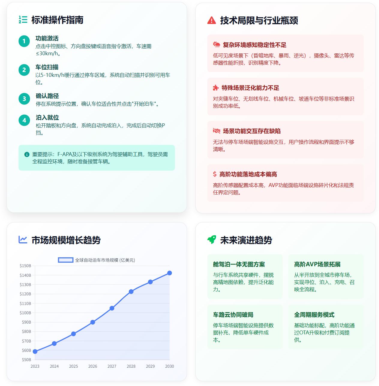 成本与普及平衡:高阶泊车系统(如AVP)依赖激光雷达、大算力芯片,成本较高,难以快速向入门级家用车下沉;低阶方案功能有限,用户体验有待提升。