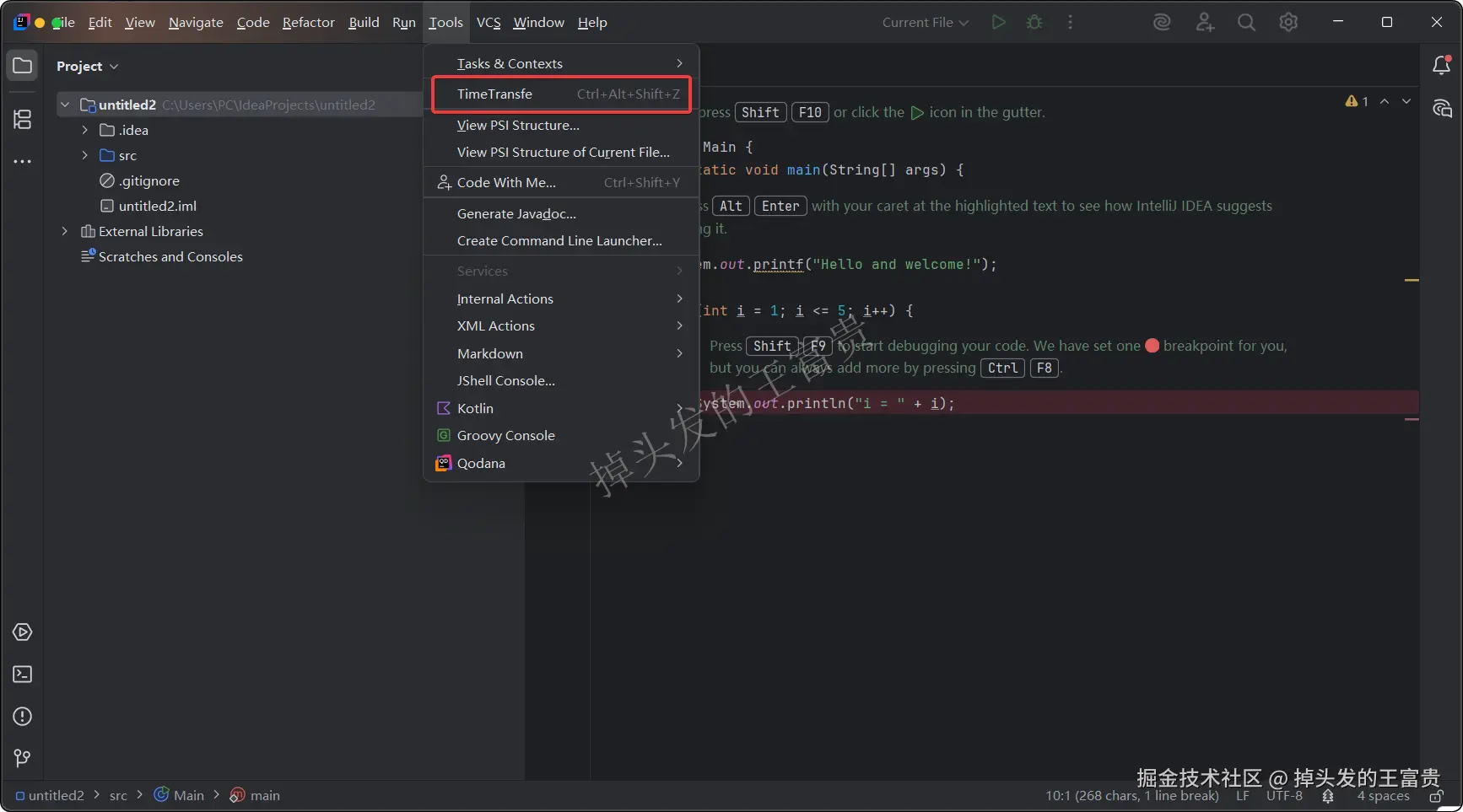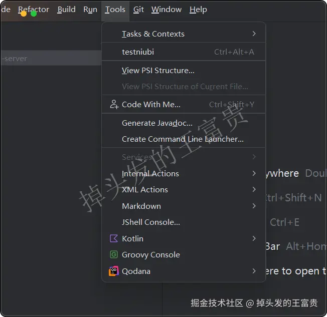 这个时候我们点击运行,就会弹出一个新的IDEA页面出来,我们可以随便打开一个项目,就进入到我们的新窗口里面了,这个时候我们点击工具就可以看到我们的插件已经加载进来了: