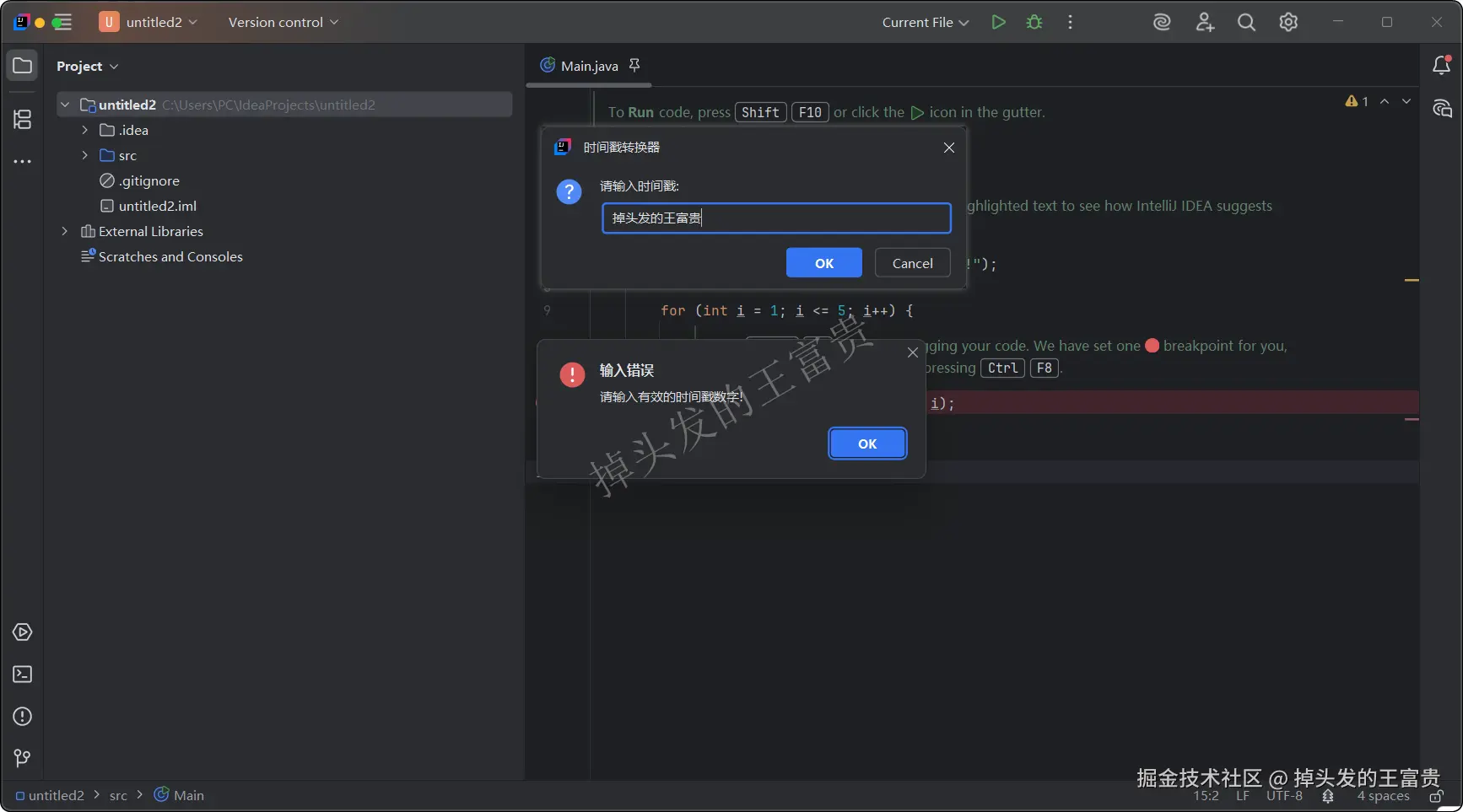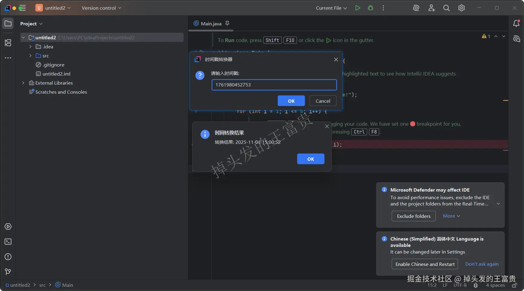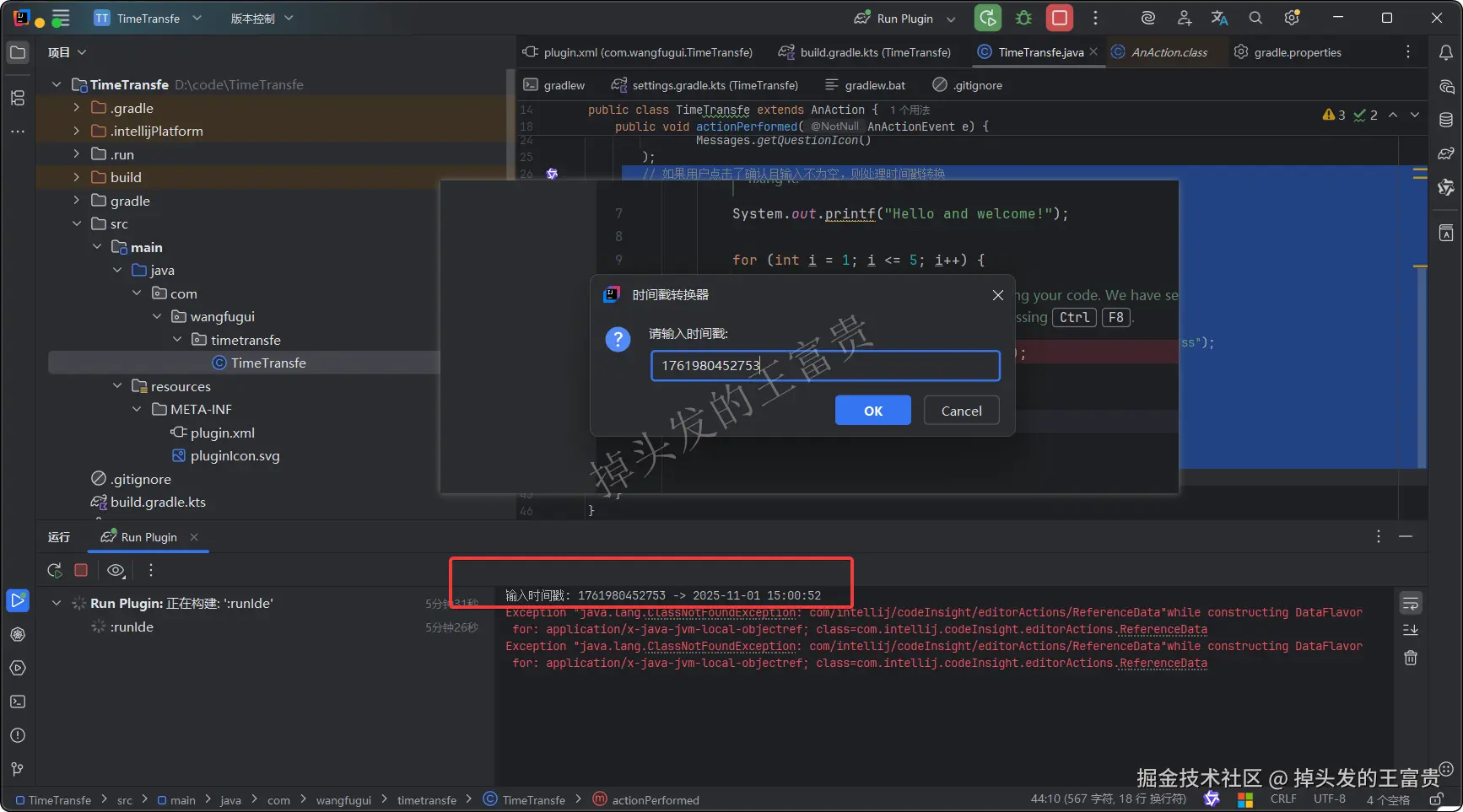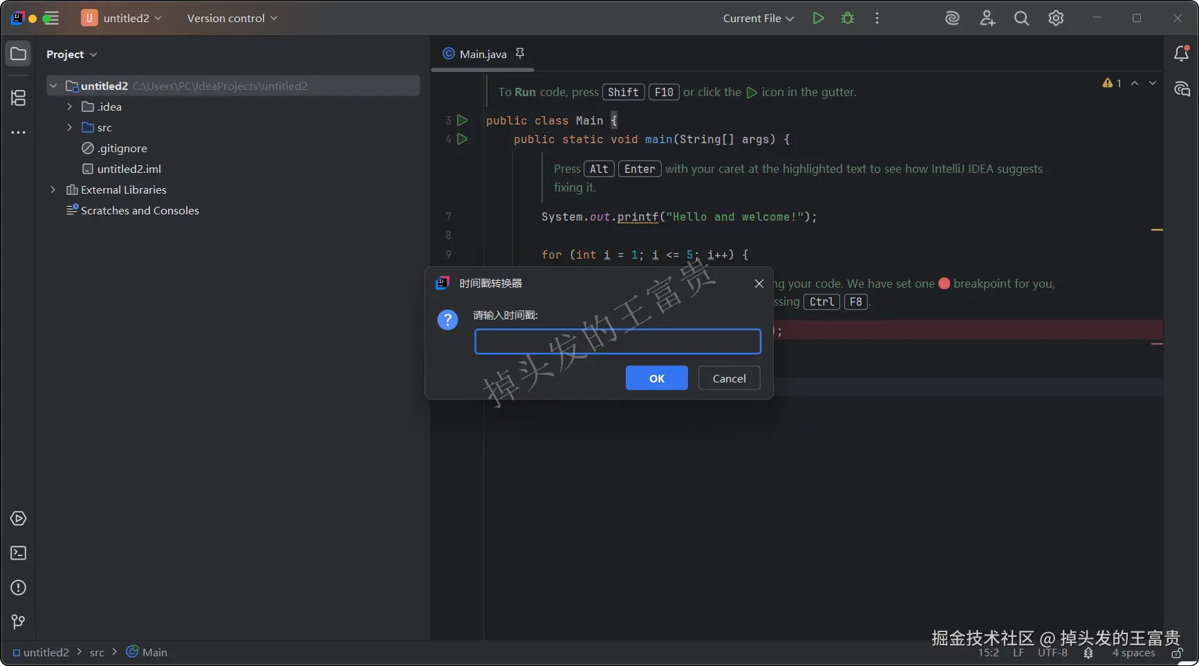 光有输入框不够啊,我们需要获取用户输入的信息,然后把这个时间戳转换为可视化的字符串出来,那么我们一步一步来,先获取用户输入的东西: Messages.showInputDialog 方法会直接返回一个参数回来,这个参数就是用户输入的内容,接着我们就正常写java代码: