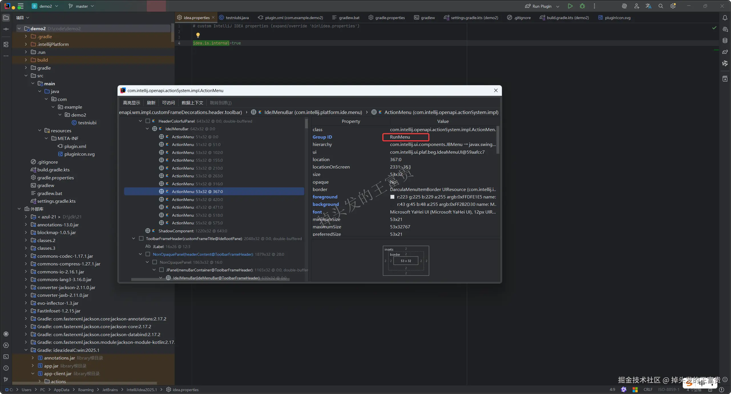 那么他的id就是ToolsMenu (该位置在IDEA的group-id),如果你想放在Run下面,那么我们可以这么查看他的group-id:
