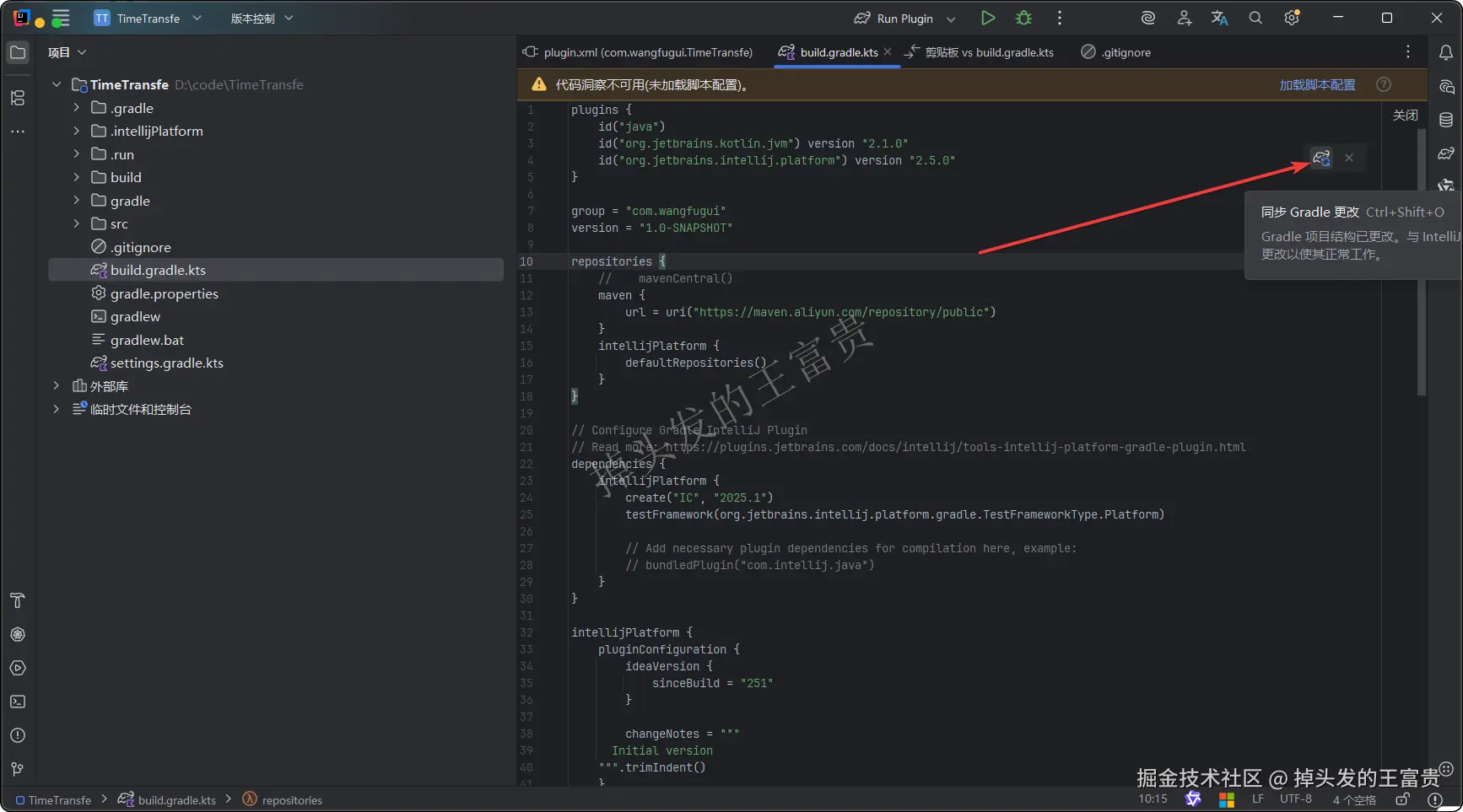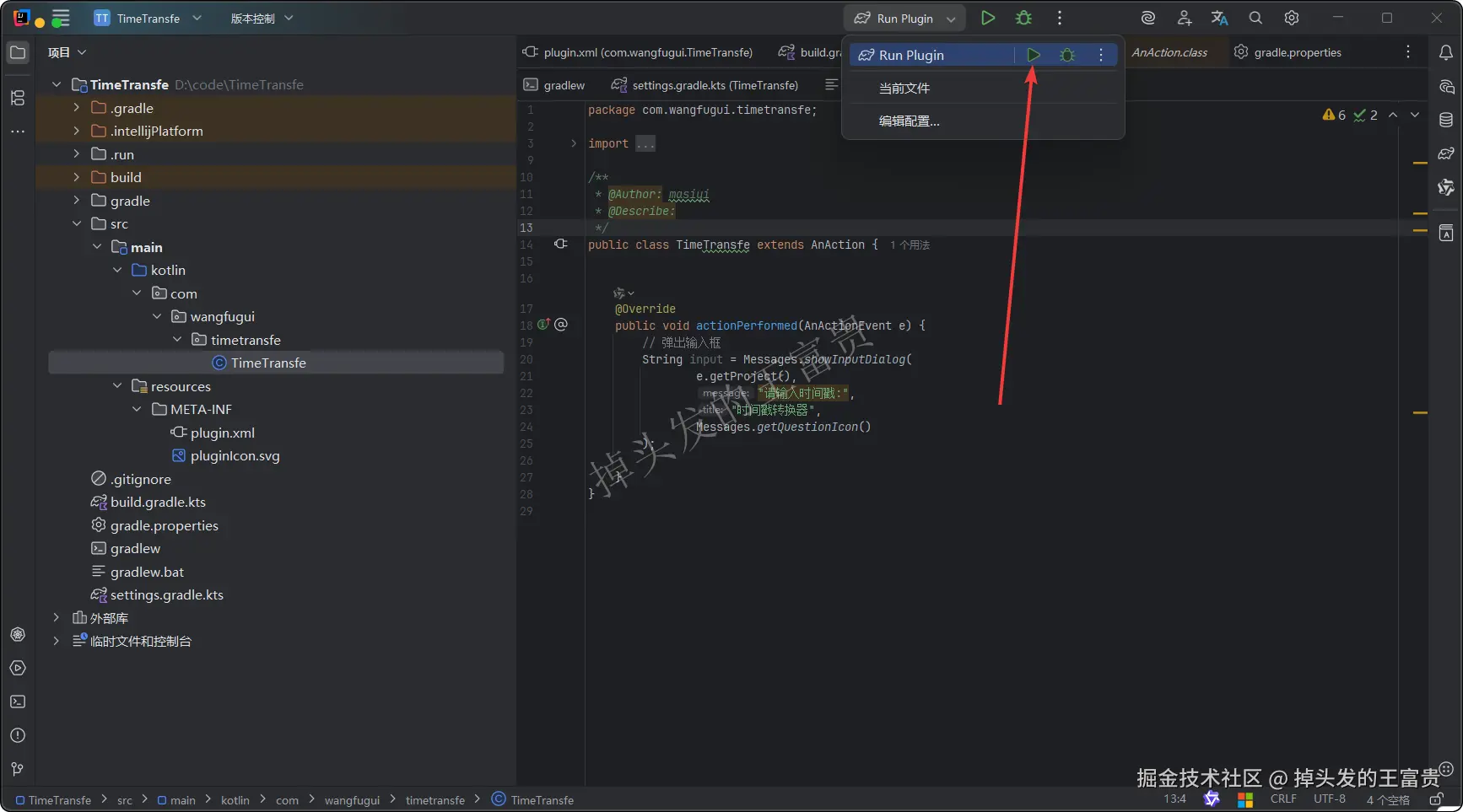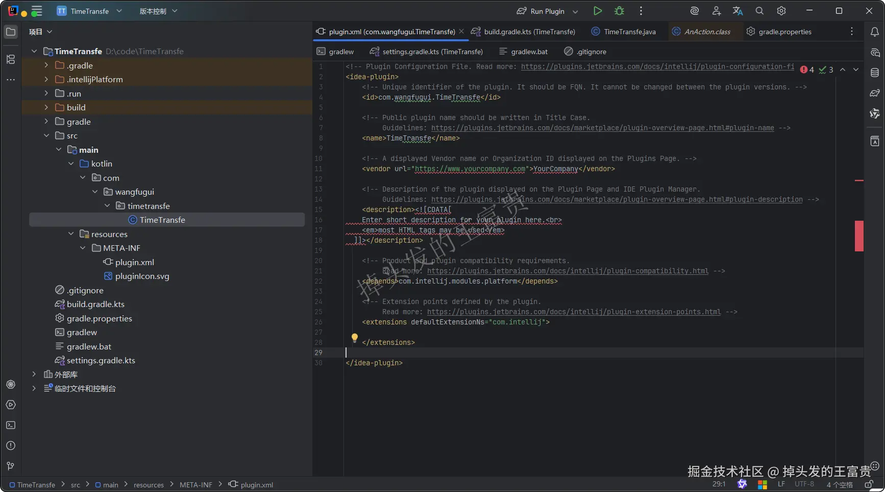 如果前面你的插件安装好了,按照步骤创建完插件,会得到一个build.gradle.kts 文件,这个时候它里面应该是这样的: