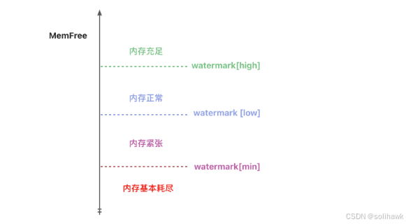 操作系统中为了衡量内存的使用情况,定义了三个内存阈值(watermark,也称为水位),分别是 watermark[min/low/high]: