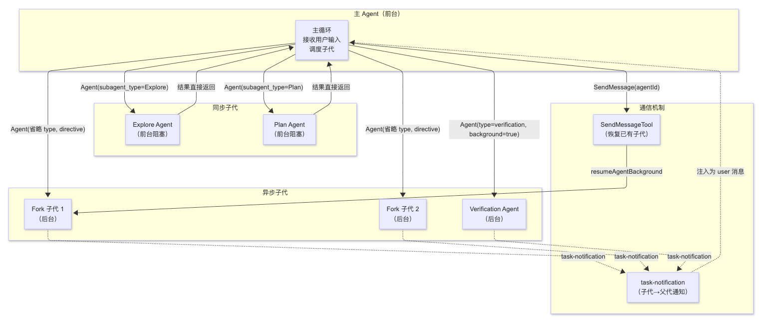 主 Agent 像调度中心;Explore/Plan 是即时助手;Fork/Verification 是后台工人;SendMessageTool 是通信管道;task-notification 是任务完成通知。