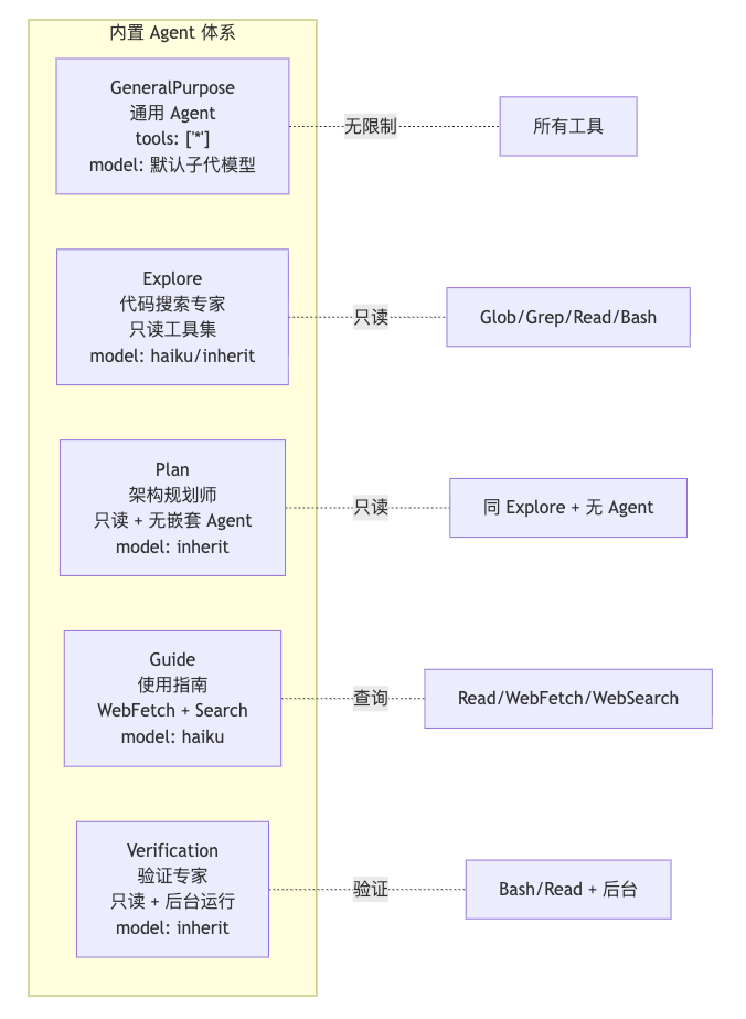- 五个子agent:GeneralPurpose 负责兜底执行,Explore 负责快速查,Plan 负责先规划,Guide 负责教你用,Verification 负责挑毛病。