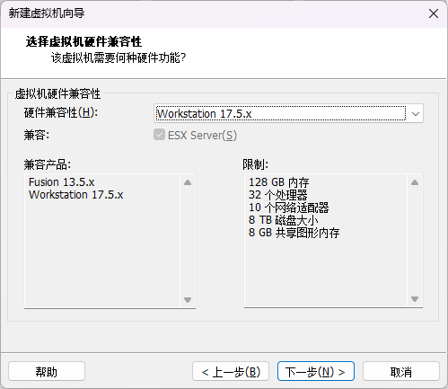- 虚拟机硬件兼容性,默认即可。