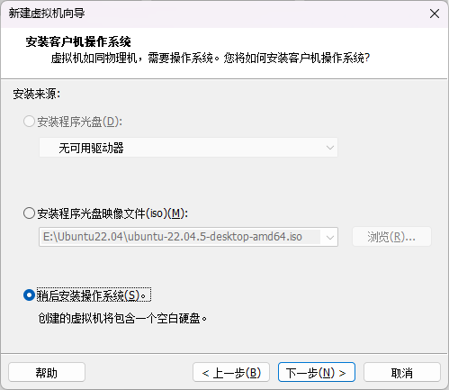 - 安装客户机操作系统,选择"稍后安装操作系统"。