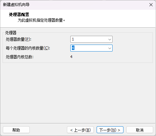 在 VMware 中配置"处理器数量"和"每个处理器核心数"并不是表示物理CPU真实被拆分,而是定义虚拟机的 vCPU 拓扑结构;现实电脑通常只有1个物理CPU(笔者电脑的CPU是4核8线程),VMware 允许模拟多个"CPU插槽"和"核心",但本质上这些 vCPU 只是操作系统层面的并行调度单位,会被宿主机(Windows)统一调度到物理4核8线程上动态运行,并不会真正独占或切割CPU资源 。因此"1×4 vCPU"**并不等于占用4个物理核心或4个线程,而是允许虚拟机最多同时运行4个可调度任务。**对于4核8线程的主机,vCPU一般建议分配1×2到1×4之间,既保证虚拟机性能,也避免过度挤占宿主机调度资源,从而造成整体卡顿。