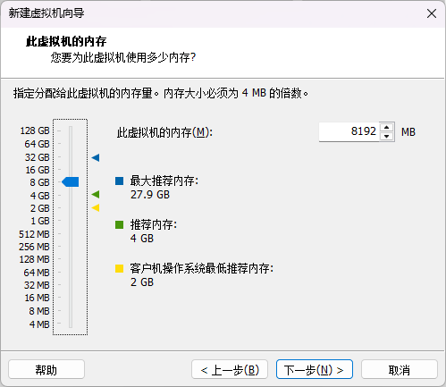 - 虚拟机内存分配根据自己电脑配置分配,建议不低于4GB。注意内存分配之后这部分内存宿主机就用不了了。