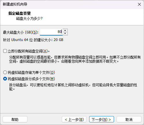 | 将虚拟磁盘拆分为多个文件 | 会将虚拟磁盘拆分成多个小文件(例如每个2GB)。主要优点是兼容性好 ,方便把大虚拟机拷到FAT32格式的U盘里(该格式限制单文件不能超过4GB)。缺点是可能因文件碎片化轻微影响性能。 |