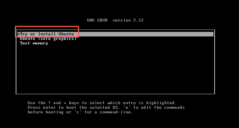 - BootLoader中默认选中 Try or Install Ubuntu。然后回车。