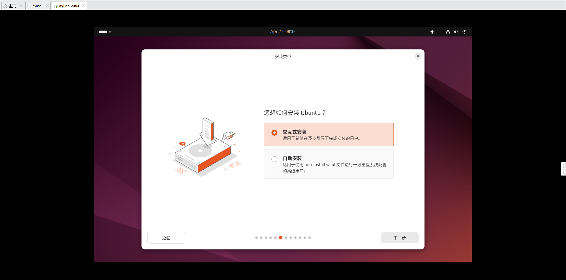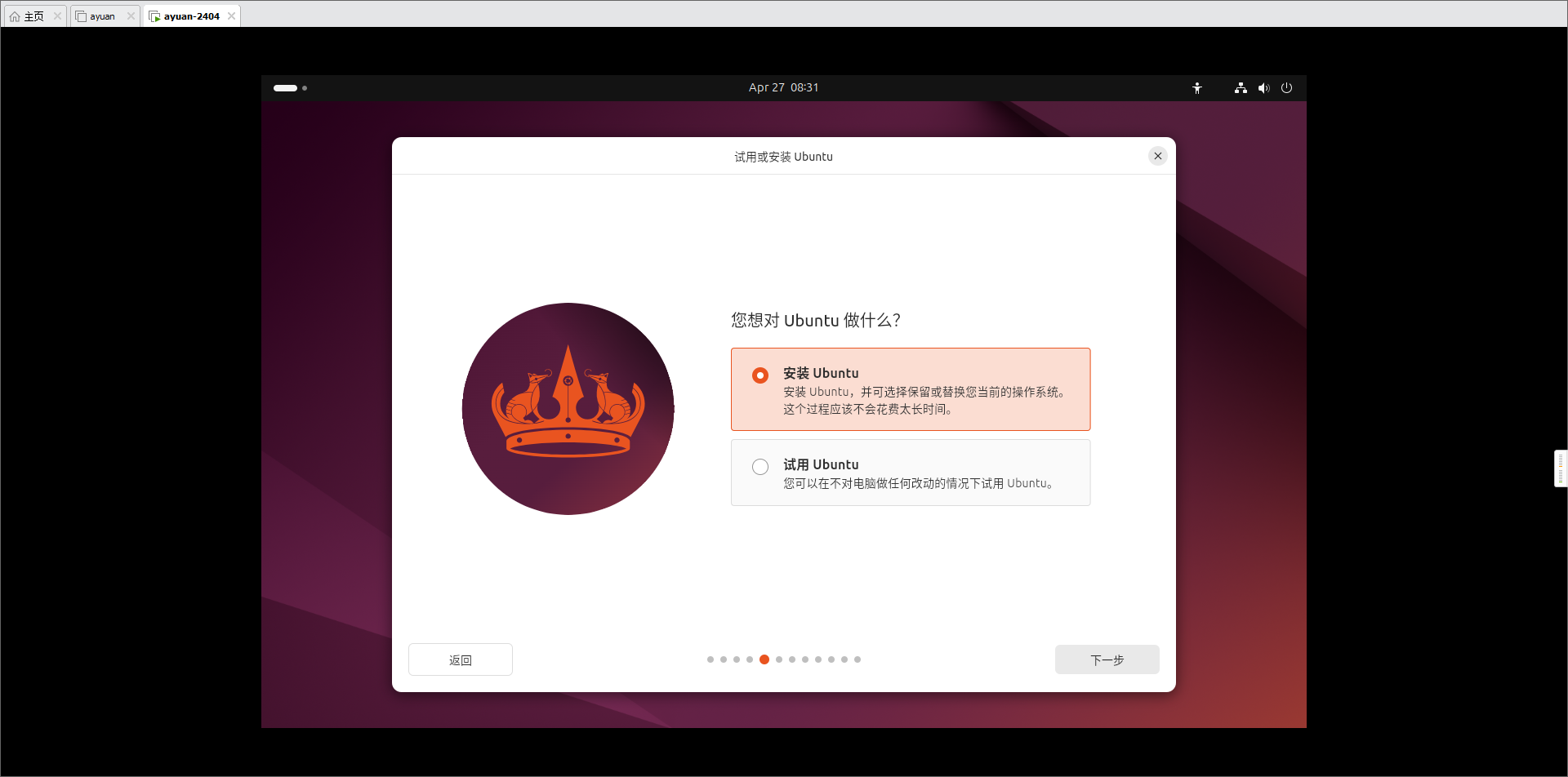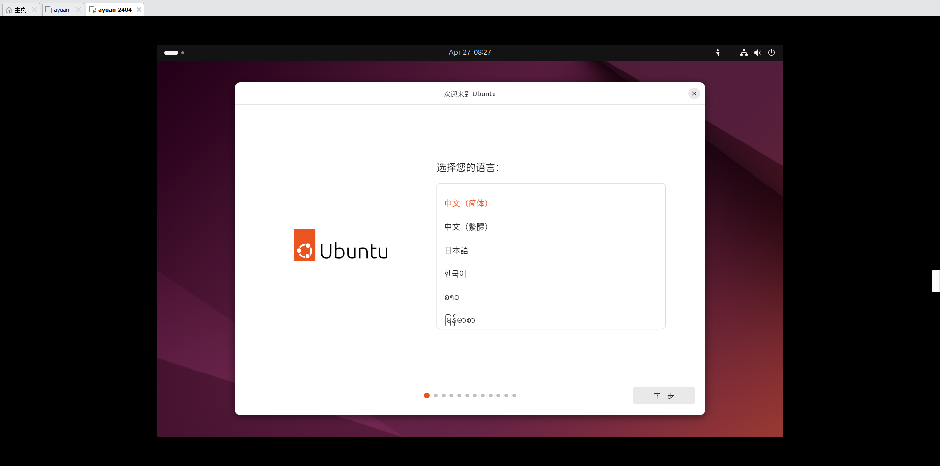 - 进入Ubuntu初始化界面,接下来是一系列的初始化选项。