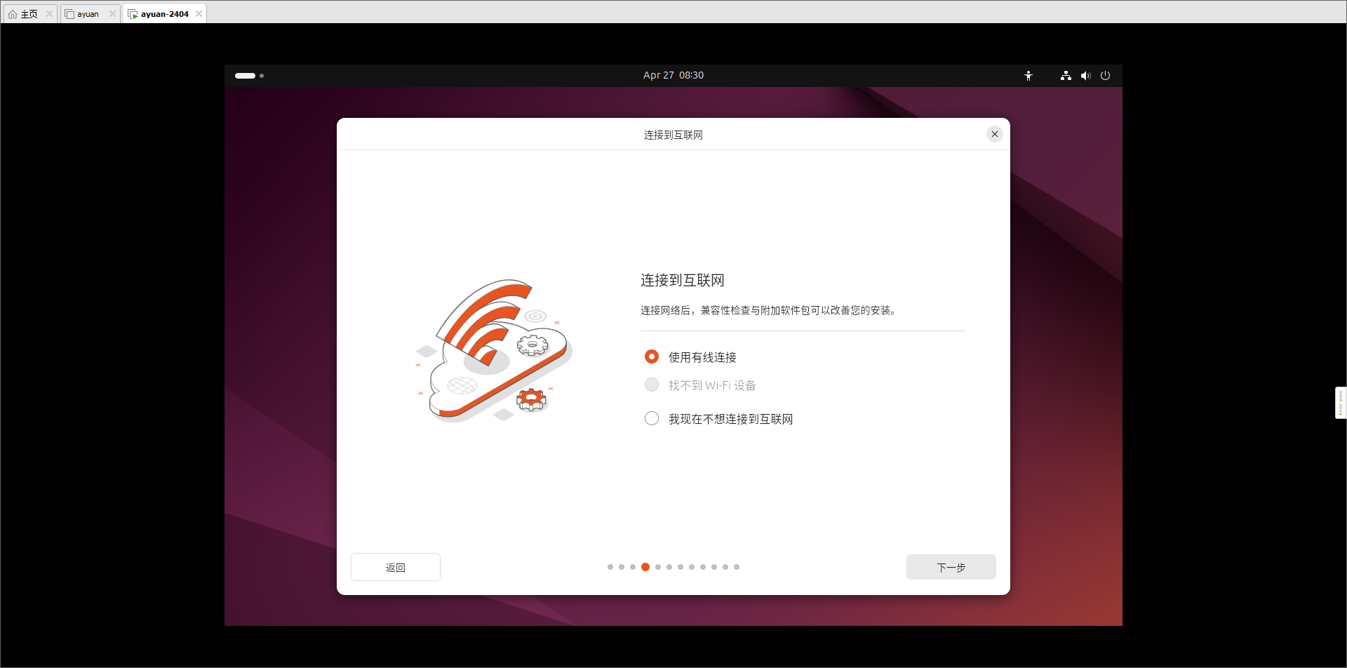 - 连接到互联网,前面我们设置虚拟机的时候网络设置了NAT模式。选择使用有线连接。