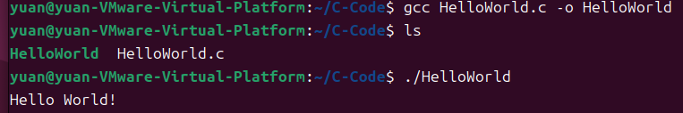 至此我们已经安装好了Ubuntu虚拟机。本节以简单的HelloWorld程序为例简单介绍一下如何在Linux环境下编译并执行简单的C语言程序。