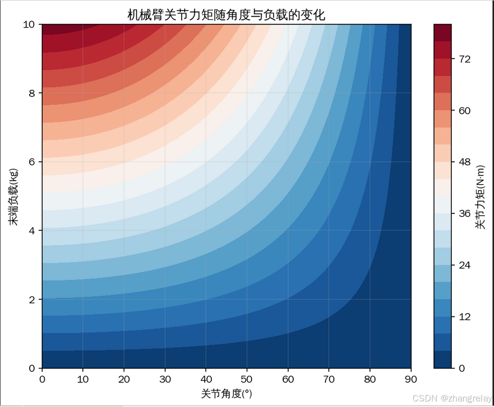 这是最容易顿悟的一个案例,程序直接画出机械臂在不同角度、不同负载下的关节力矩分布。当机械臂姿态变化时:垂直向下的姿态,负载重力和臂长方向重合,关节力矩几乎为 0,电机完全不费力水平伸出的姿态,力矩达到最大值,电机负载最大,最容易过载通俗大白话:不管机械臂怎么动,力矩 = 力 × 力臂这个物理规则永远不变,它是机械臂电机选型、负载能力设计、轨迹规划的核心依据。这就是刚体静力学最本质的意义:机器人运动与负载的受力骨架。