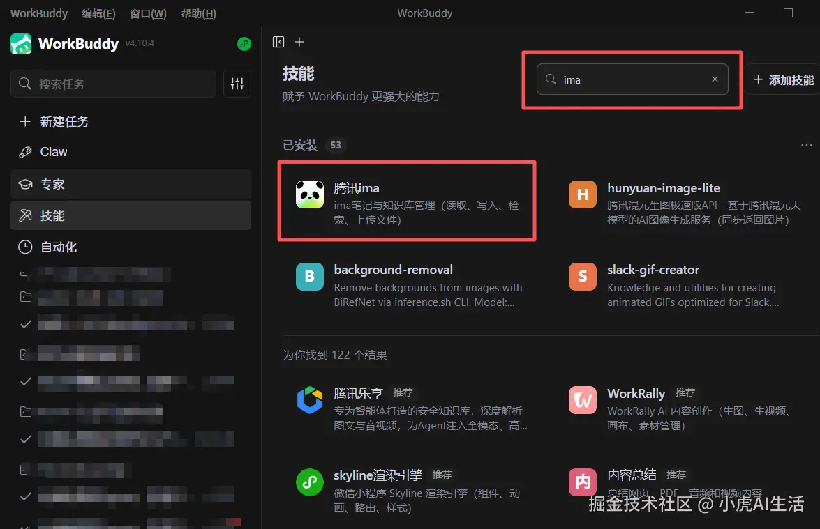 WorkBuddy 左侧菜单找「技能 」,搜索 ima-skill,安装。