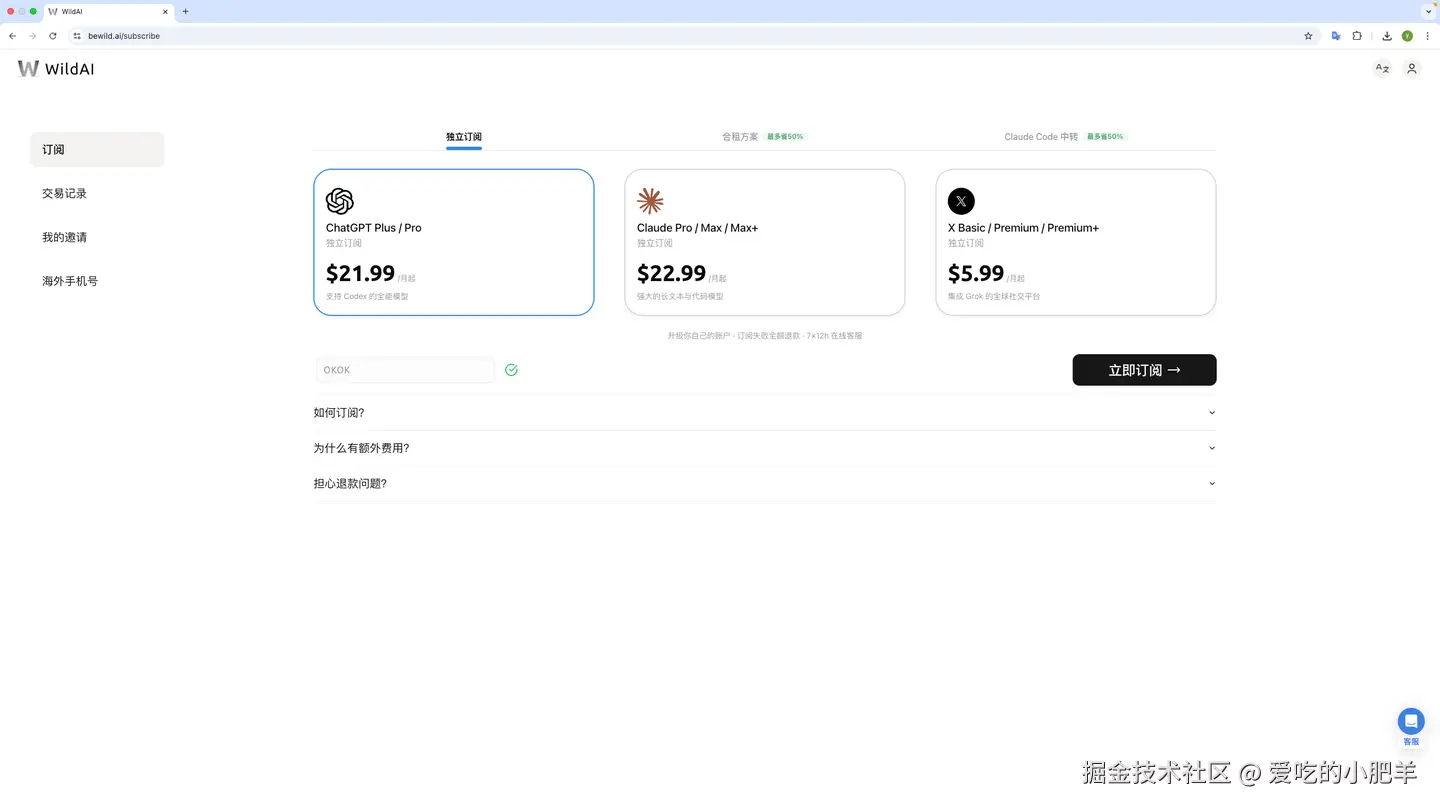WildAI是目前最省心的方法。微信支付、不需要海外卡、不用提交账号密码,生成一个临时 Session Key 就能用,几分钟搞定。封号也能退款。