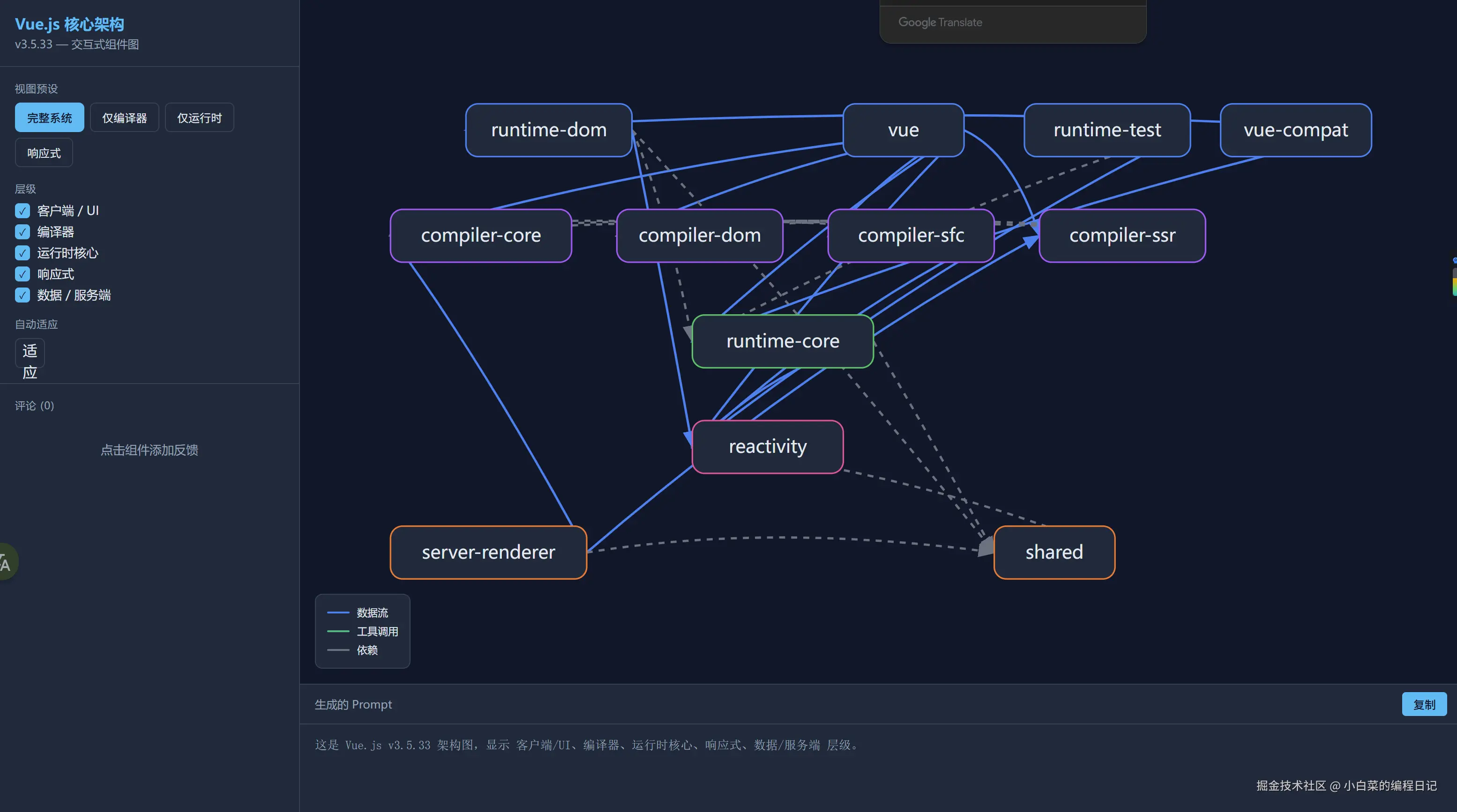 这是 Vue.js v3.5.33 架构图,显示 客户端/UI、编译器、运行时核心、响应式、数据/服务端 层级。