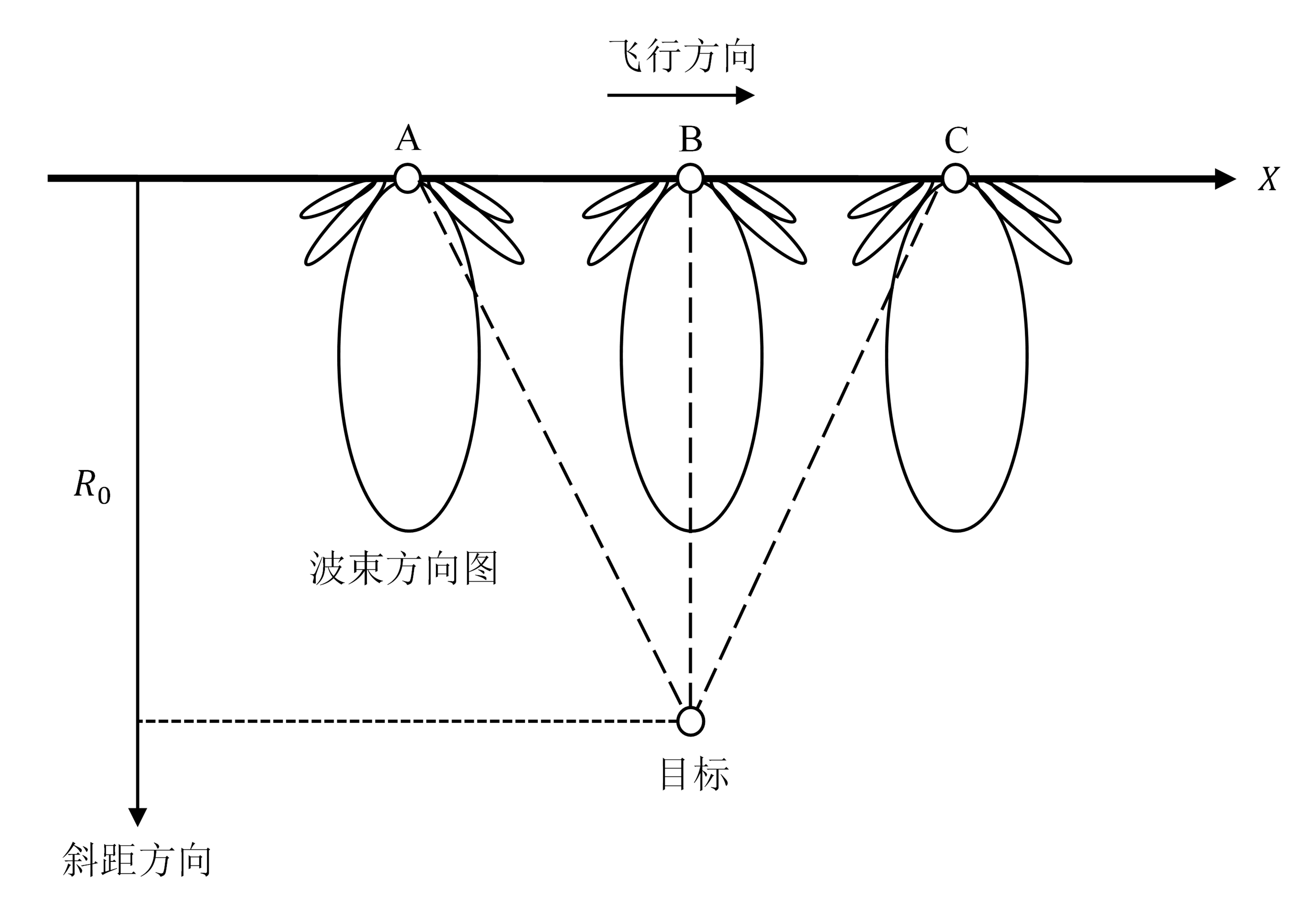 随着平台的前进,地面上的某个目标被数百个脉冲照射。主要由于方位向波束方向图 的影响,每个脉冲的回波信号强度存在变化。下图以斜距平面内的3个传感器位置为例,示意了正侧视情况下的方位向波束方向图。
