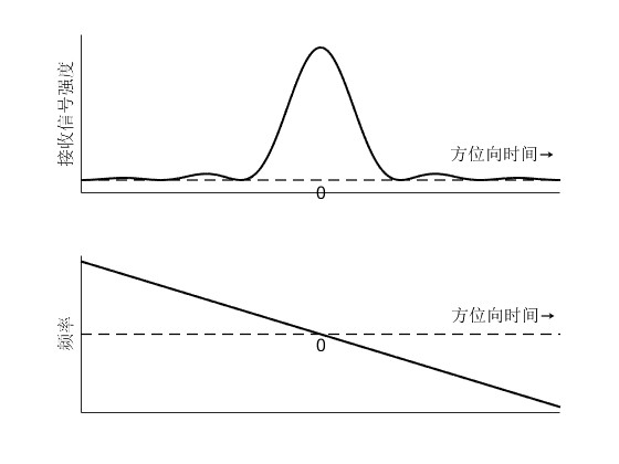 下图示意了方位向波束方向图对接收信号强度和多普勒频率的影响。多普勒频率正比于目标相对于传感器的径向速度。当目标接近雷达时多普勒频率为正, 当目标远离雷达时多普勒频率为负,因此频率随时间变化曲线的斜率为负。